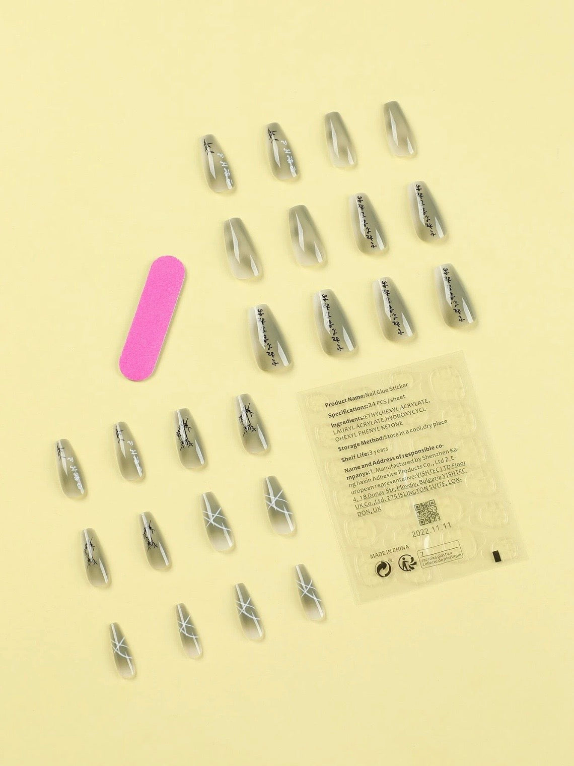 Adorn your fingertips with our "Bamboo Charm" Coffin Nails, featuring a stunning design that includes one nail with a bamboo print and others adorned with elegant Chinese characters in white or black. The nails boast a beautiful glossy finish and a subtle ombre from white to bamboo green, adding sophistication to your look.