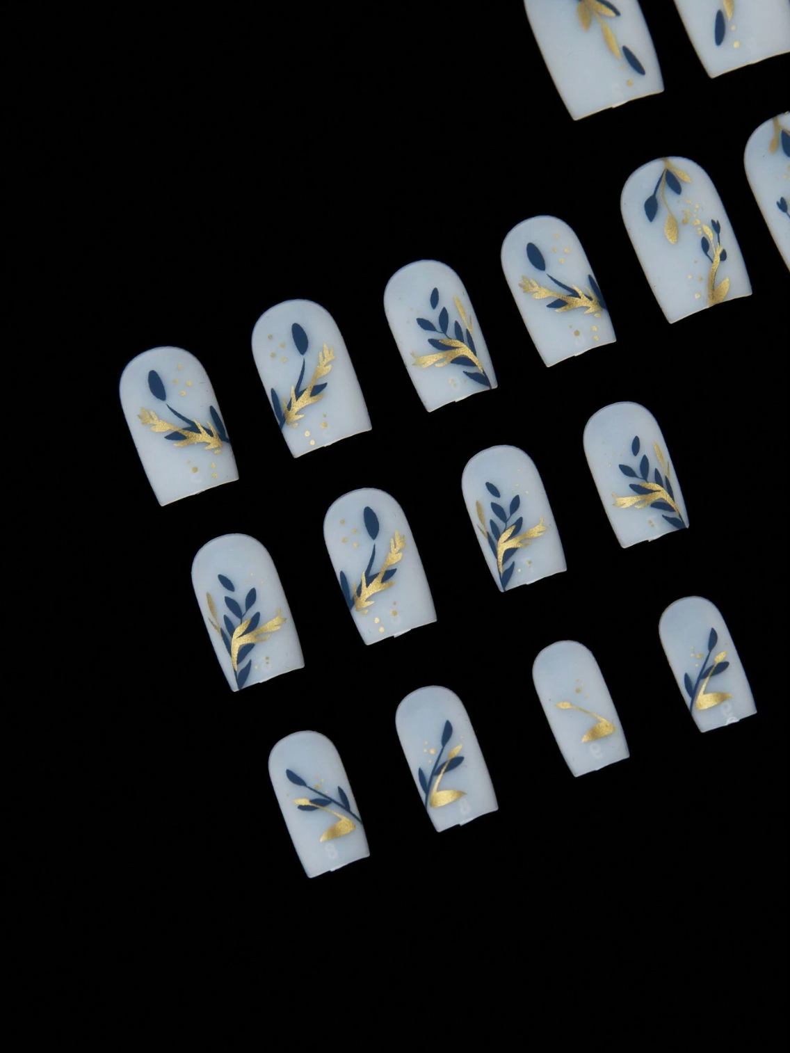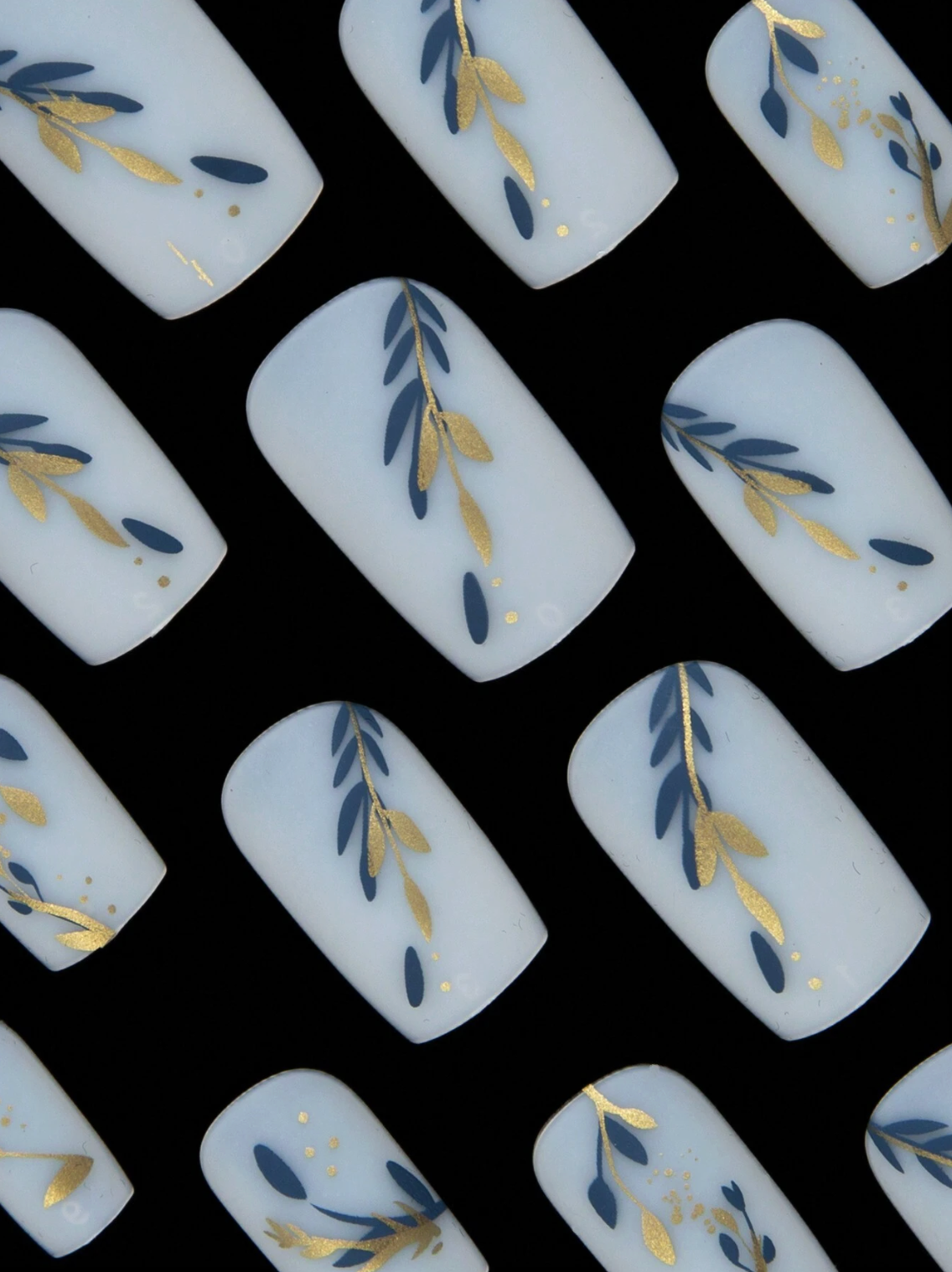 Falling Leaves is a soft and sophisticated set inspired by nature’s elegance. Each nail features a creamy white base decorated with delicate navy leaf accents and subtle touches of gold, creating a timeless and graceful look. The design feels fresh yet refined — perfect for anyone who loves a mix of minimalism and artistry.