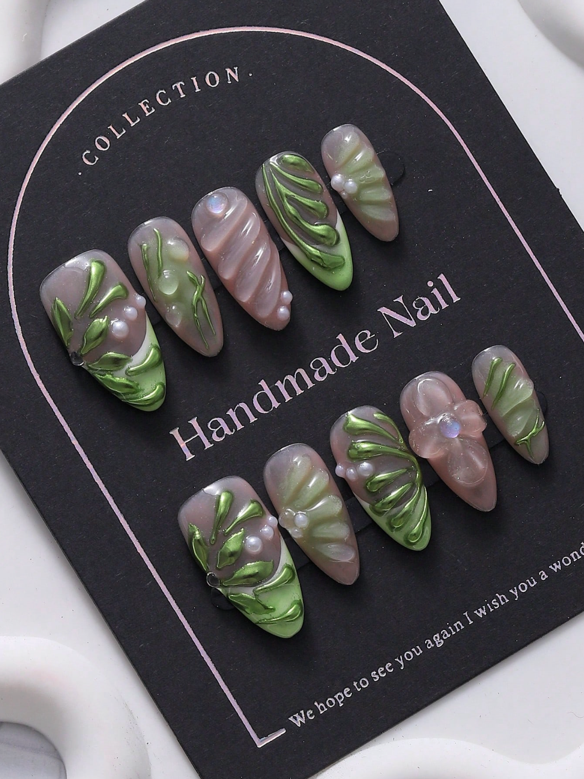 Step into the soft, romantic world of Lover’s Garden — a hand-sculpted nail set inspired by blooming florals and dewy mornings. A soft blend of romance and nature, this set blooms with pearly petals, lush green vines, and sculpted flowers that feel like love in full spring. Each nail is handcrafted with delicate detail, creating a design that whispers of secret gardens, gentle touches, and moments worth holding onto.