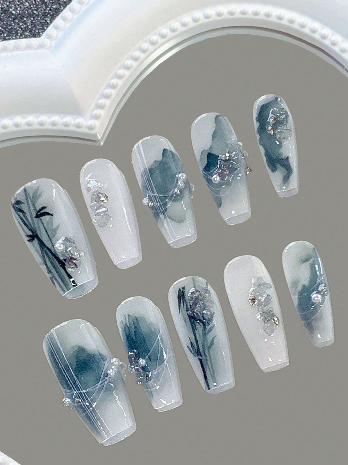 The "Serene Mist" nails from our Made with Love collection offer a delicate balance of artistic flair and refined elegance. These press-on nails feature a soft, misty marble effect in soothing shades of blue and white, complemented by subtle hand-painted floral accents. Adorned with intricate pearls and shimmering crystals, each nail is a masterpiece of craftsmanship and attention to detail.