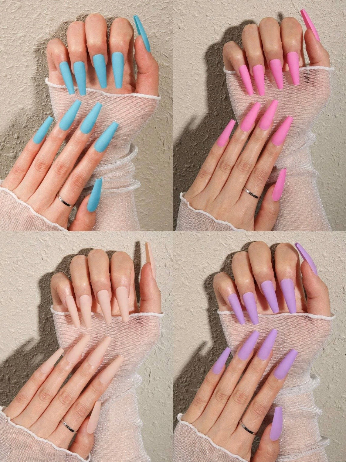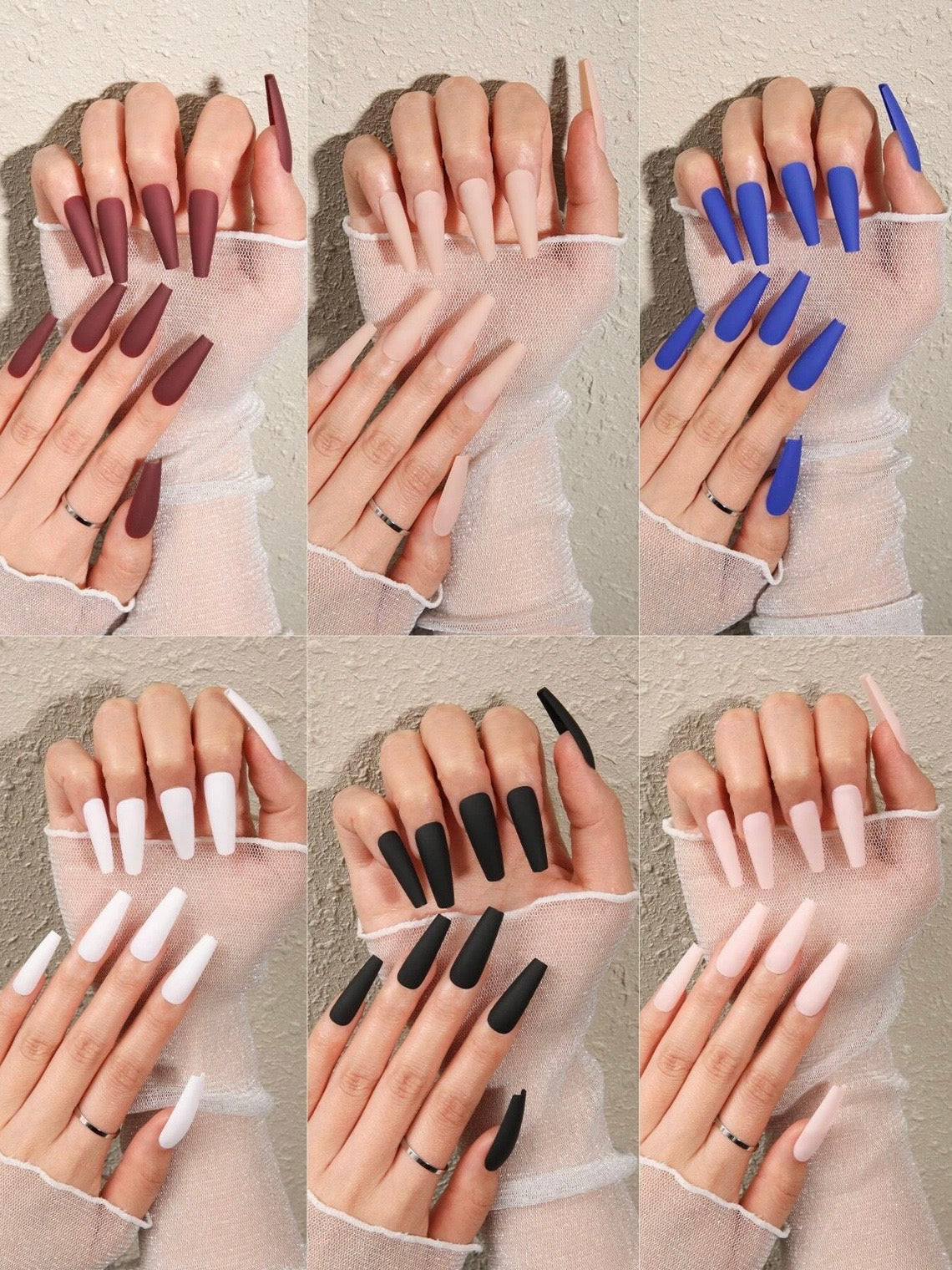 Introducing our "Timeless Elegance Collection" press-on nails, a set of 10 stunning long matte coffin nails. This versatile set features a beautiful palette of colors, including white, black, cream, light pink, light blue, beige, dark brown, dark blue, and pink. The mix of soft and dark shades creates a harmonious and peaceful look, perfect for any occasion. Whether you're dressing up for a special event or keeping it chic and stylish for everyday wear, the "Timeless Elegance Collection" is your go-to choice for effortlessly sophisticated nails.