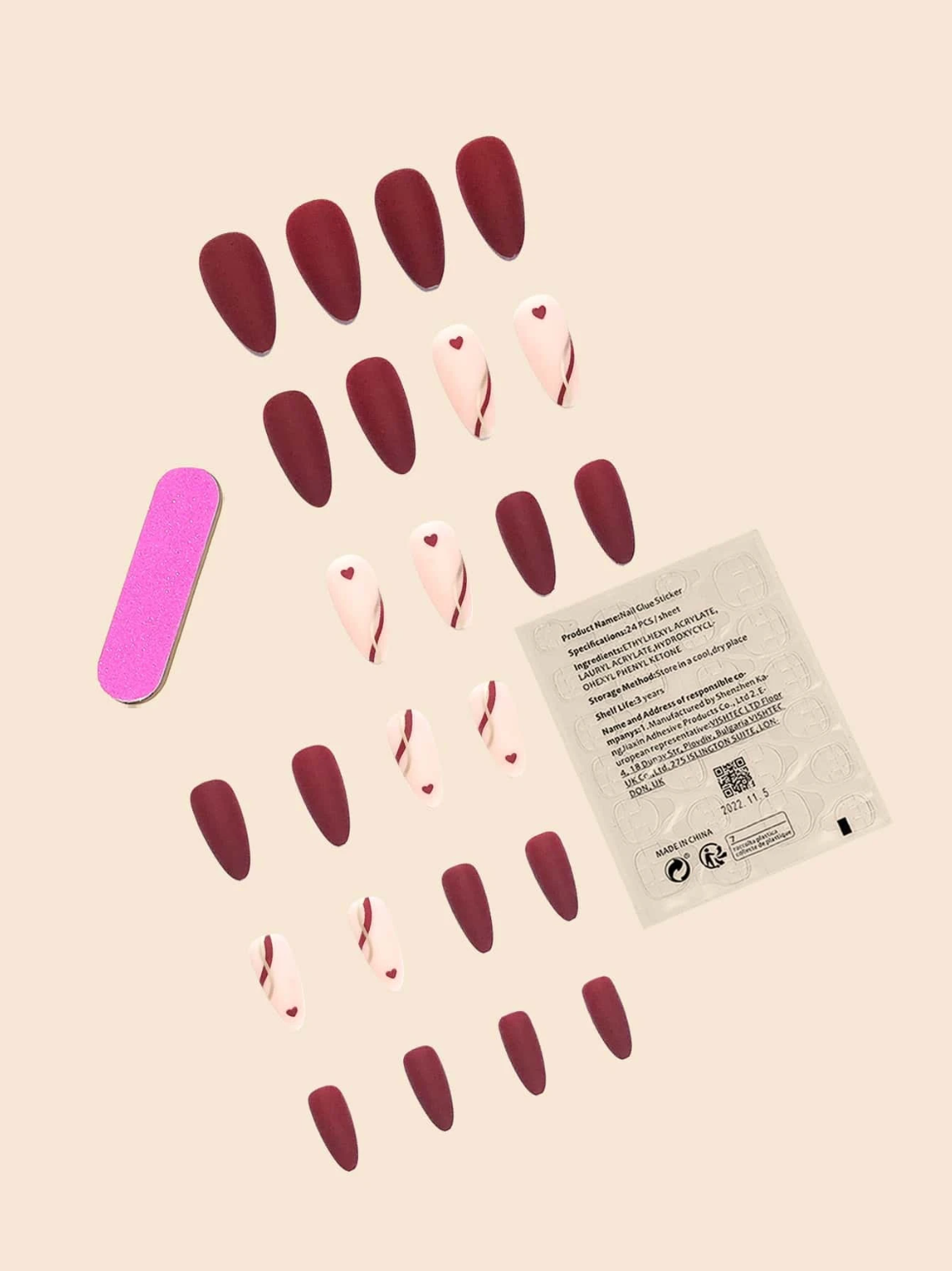 Twin-Flame is a design inspired by deep connections and destined love. This elegant set features a soft nude base with rich red accents, flowing gold details, and delicate heart embellishments, symbolizing two souls perfectly intertwined. The mix of matte and glossy finishes adds contrast, creating a timeless and sophisticated look.